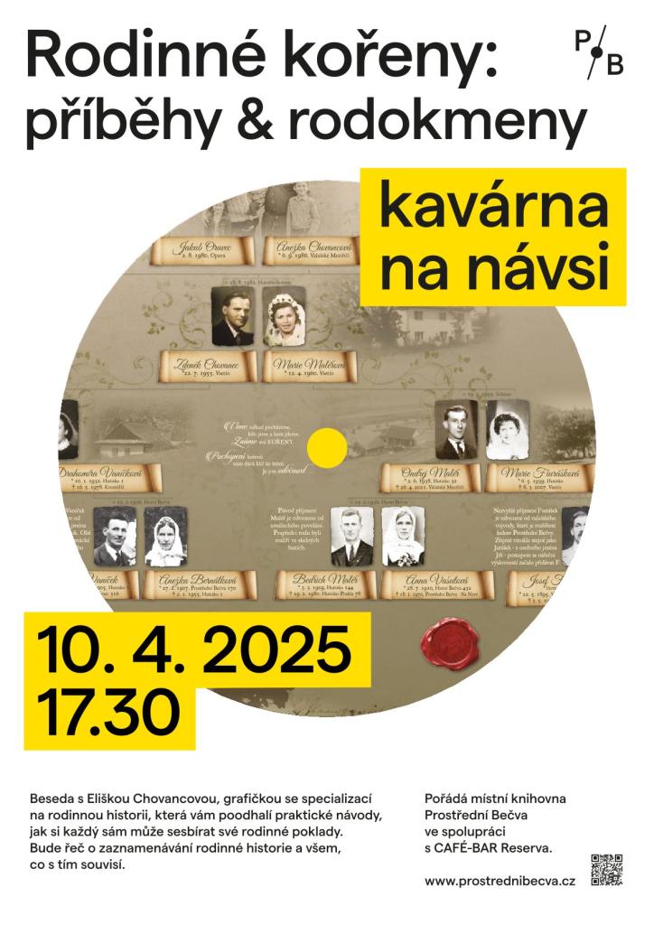 Srdečně Vás zveme ve čtvrtek 10.4. do kavárny na návsi na besedu s grafičkou a malířkou paní Eliškou Chovancovou, která nám dá praktické návody, jak si každý sám může sesbírat své rodinné poklady. Bude řeč o zaznamenávání rodinné historie a všem, co s tím souvisí.