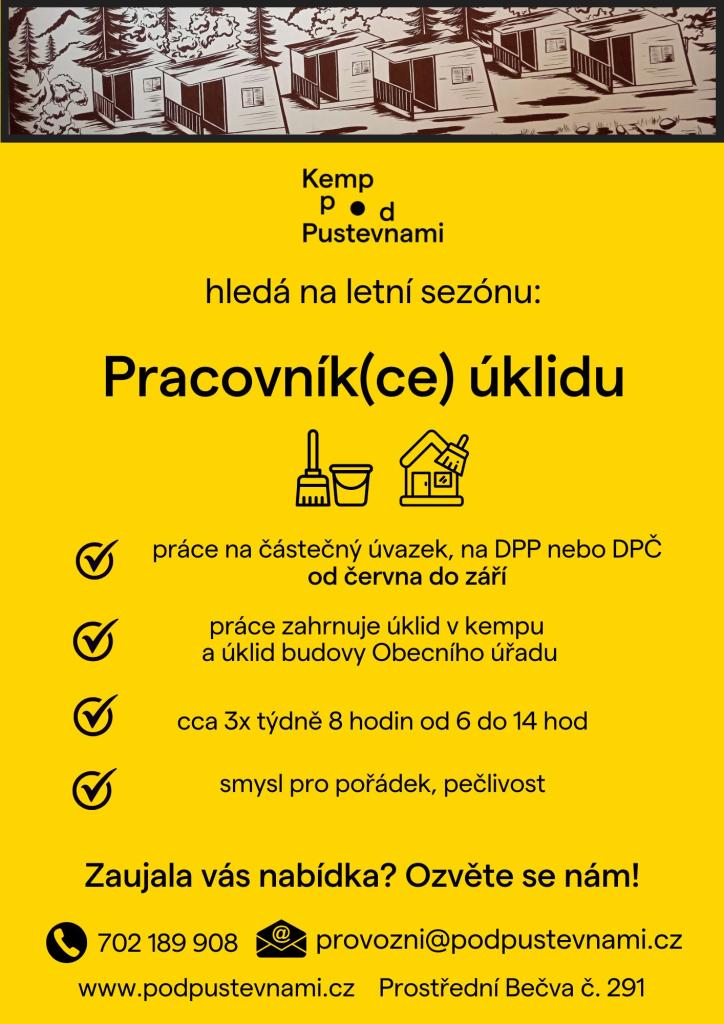 Hledáme pracovníka/ci úklidu do Kempu pod Pustevnami.