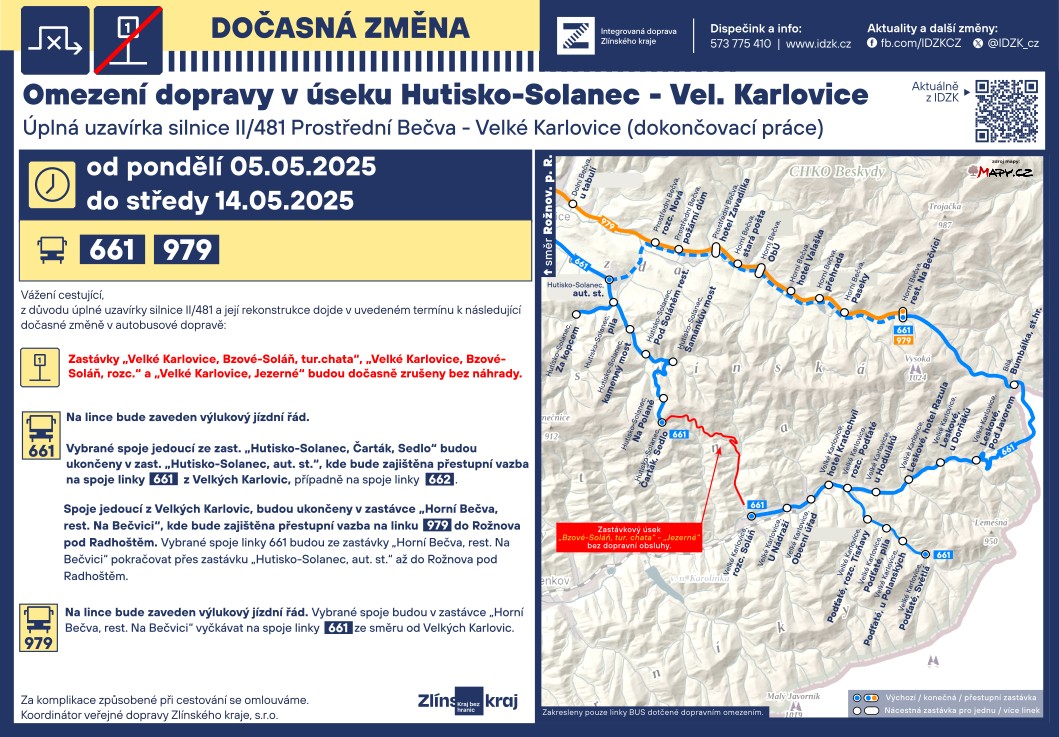 Omezení autobusové dopravy v úseku Hutisko Solanec - Velké Karlovice a úplná uzavírka v úseku Soláň Čarták - Velké Karlovice