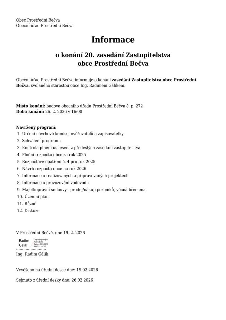 Obecní úřad informuje, že ve čtvrtek 26.2.2026 v 16:00 se koná 20. zasedání zastupitelstva obce.
