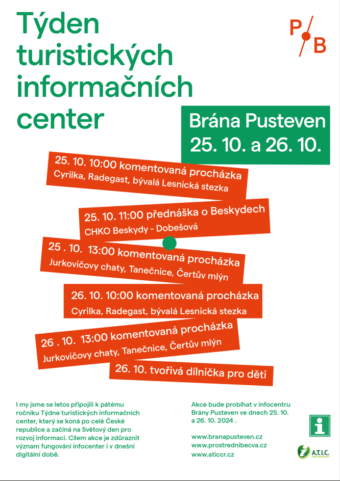 Letos se připojíme i my. Akce bude probíhat ve dnech 25. a 26. 10. v infocentru Brány Pusteven. Těšit se můžete na komentované procházky, přednášku o Beskydech i dílničku pro děti.