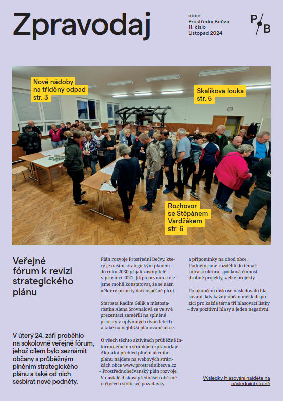 Obsah: str. 1-2 Veřejné fórum - ohlédnutí, str. 3 výdej popelnic na tříděný odpad + jak třídíme, str. 4-5 nový stavební zákon, str. 6-7 rozhovor se Štěpánem Vardžákem, str. 11-12 novinky z knihovny, str. 13-14 novinky ze ZŠ a MŠ, str. 16-19 ze sportu