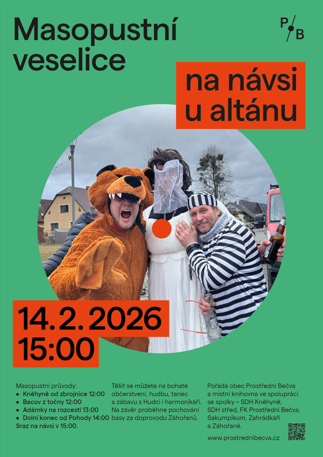 Průvody masek povedou medvěda za doprovodu harmonikářů a dalších muzikantů,   navštíví každou domácnost, která je přivítá. Všichni se pak sejdeme ve tři hodiny na návsi, kde budou připraveny stánky s občerstvením: CAFÉ-BAR Reserva, Bečvanské sýry, placky i sladké bubble waflle. Klobásky k zakoupení i něco dobrého na zub připraví i zahrádkáři.